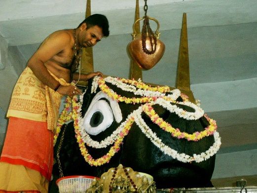 Bengali. Priest performs Shivapuja, worship of Shiva in his linga form, in a village temple in West Bengal.